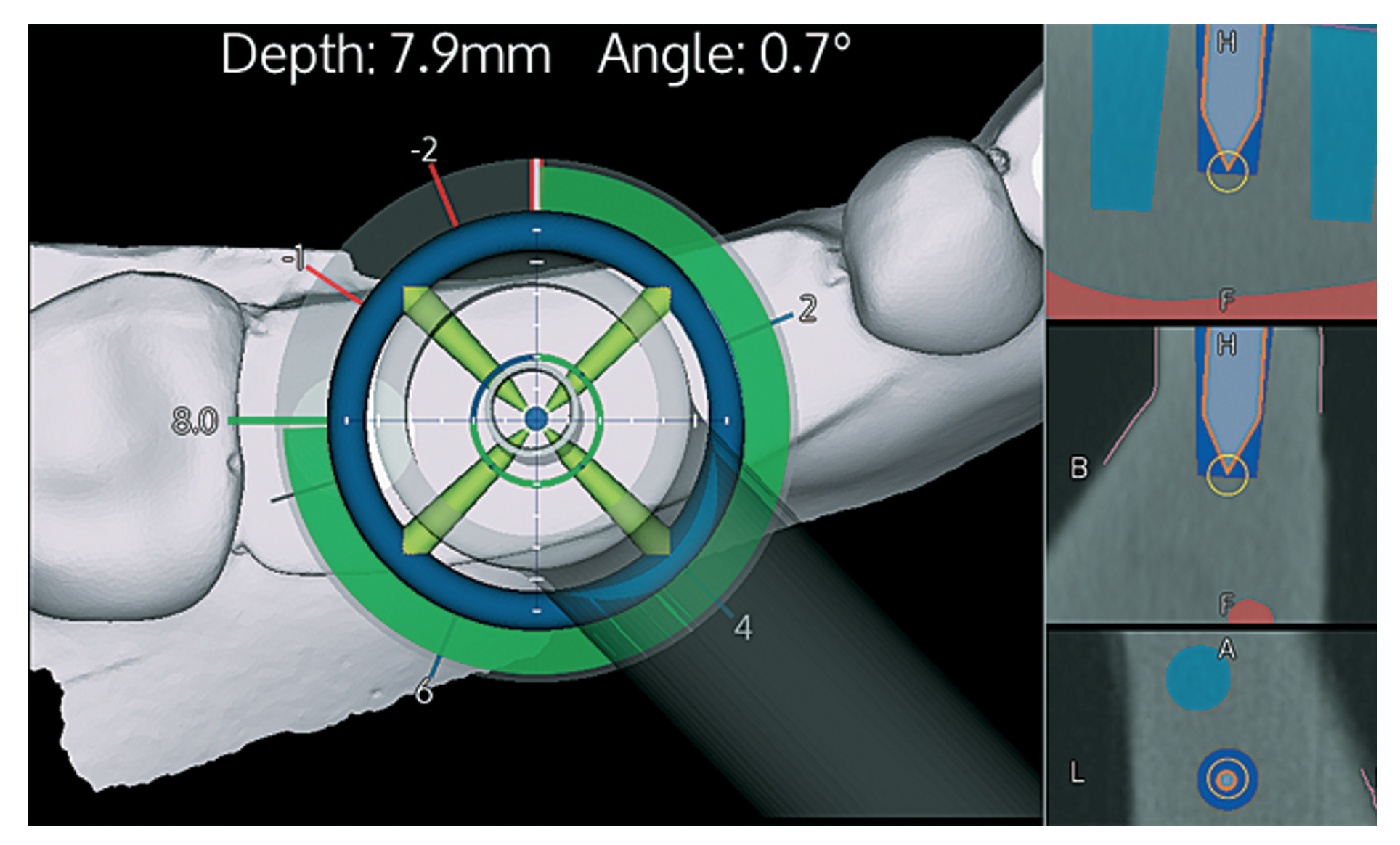 Grazie a questo accoppiamento tra la situazione reale e la progettazione virtuale dell’intervento, il chirurgo ritroverà sullo schermo del computer tutte le indicazioni per eseguire al meglio l’intervento, ovvero corretta posizione dell’impianto, corretta inclinazione nelle tre dimensioni e distanza accurata in decimi di millimetro da quelle che sono le strutture nobili a rischio, come vasi e nervi.